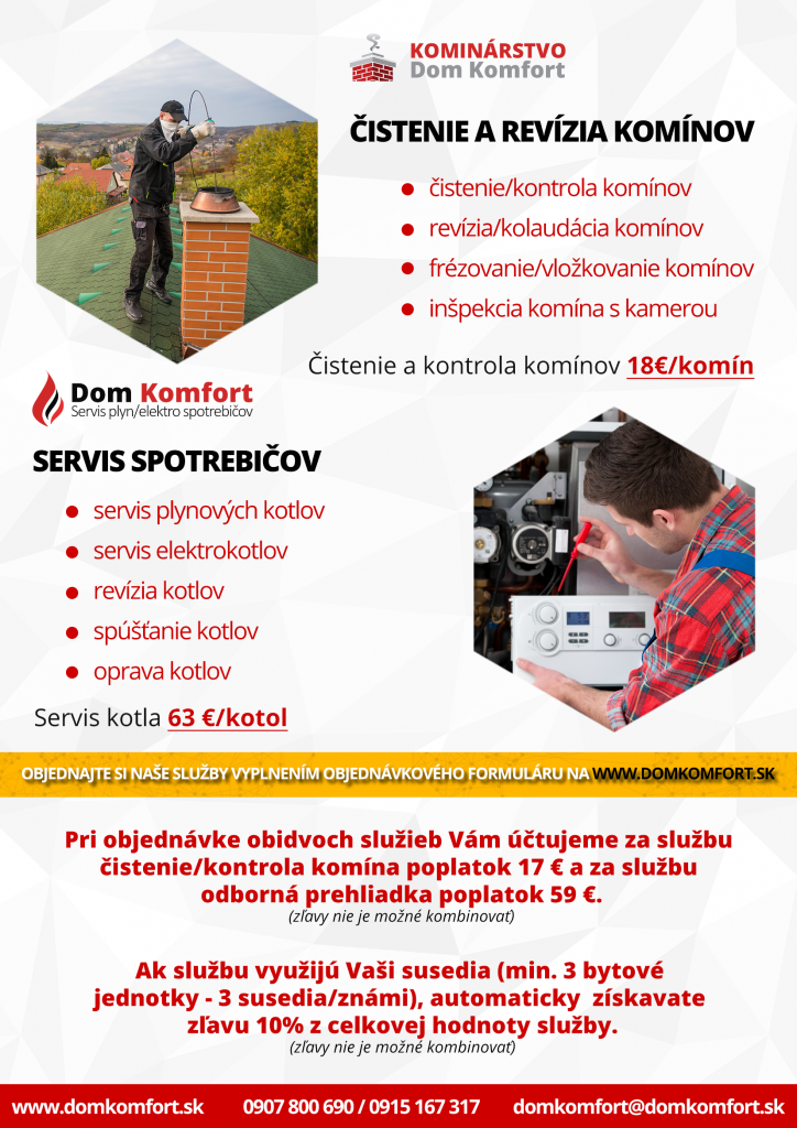 Oznamujeme obyvateľom, že 20. a 21. februára 2020 (štvrtok,piatok) Kominárstvo Dom Komfort zabezpečí ročnú revíziu komínov a odborný servis plynových kotlov.